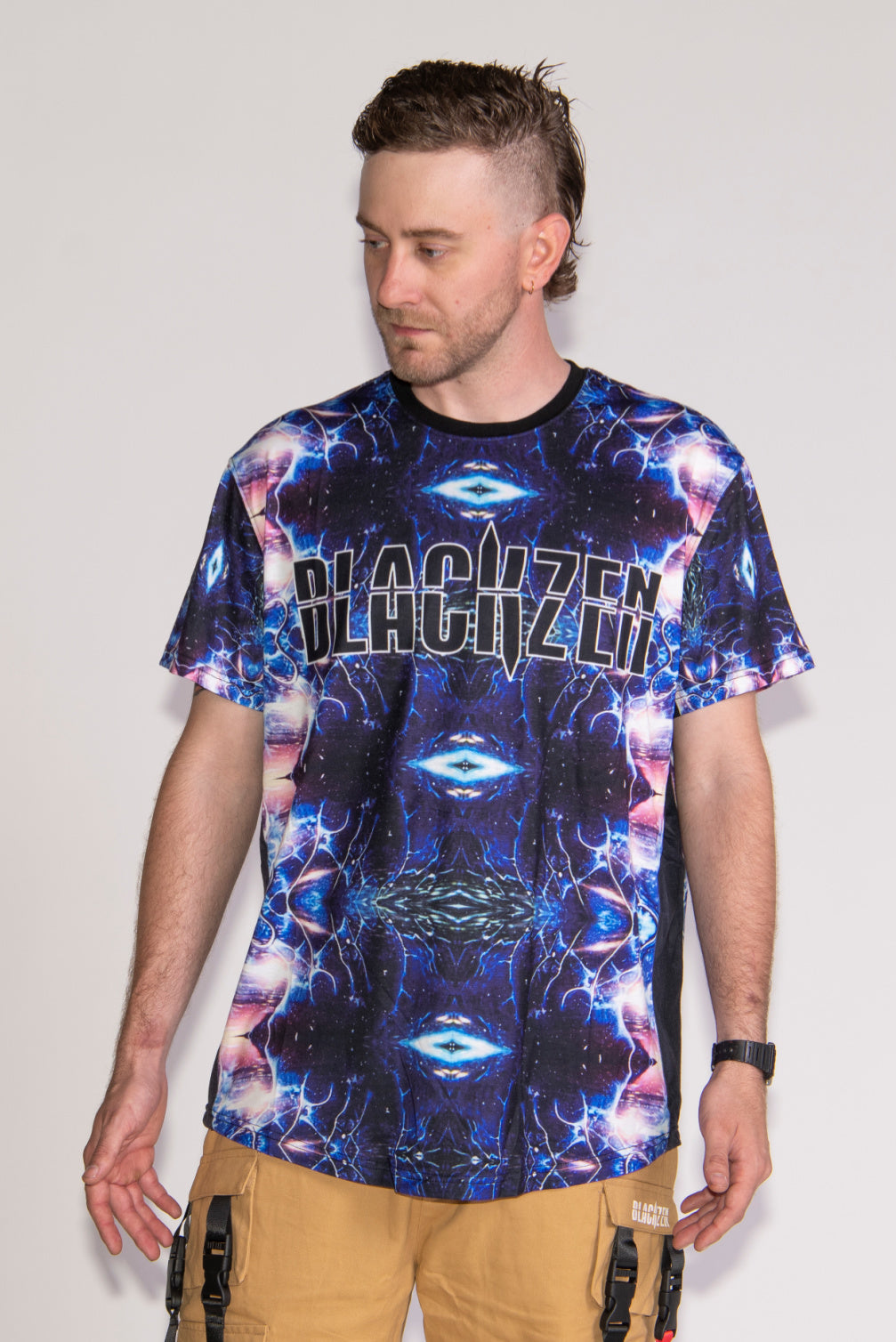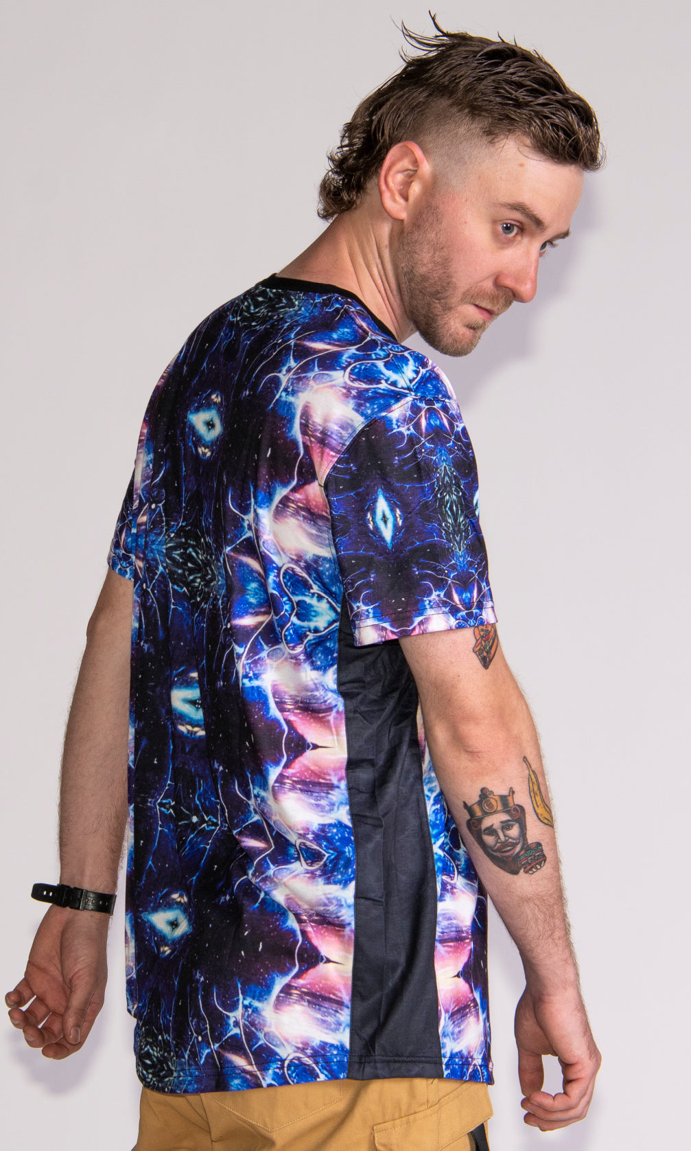 Everything is Fractals, including this design! Super soft no fade design.Trippy Galactic Artwork designed by Demi Casares on a polyester Shirt.
