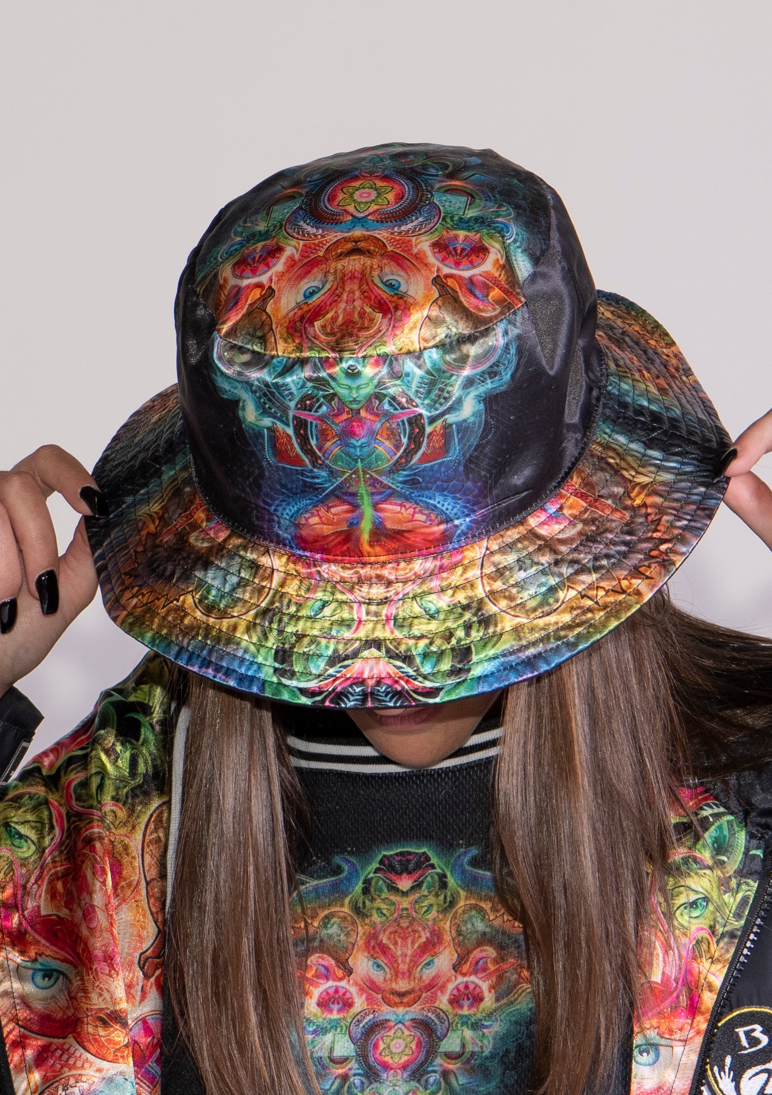 reversible bucket hat suede on one side and silky smooth trippy designs on the other. Artwork by Eloh Project.