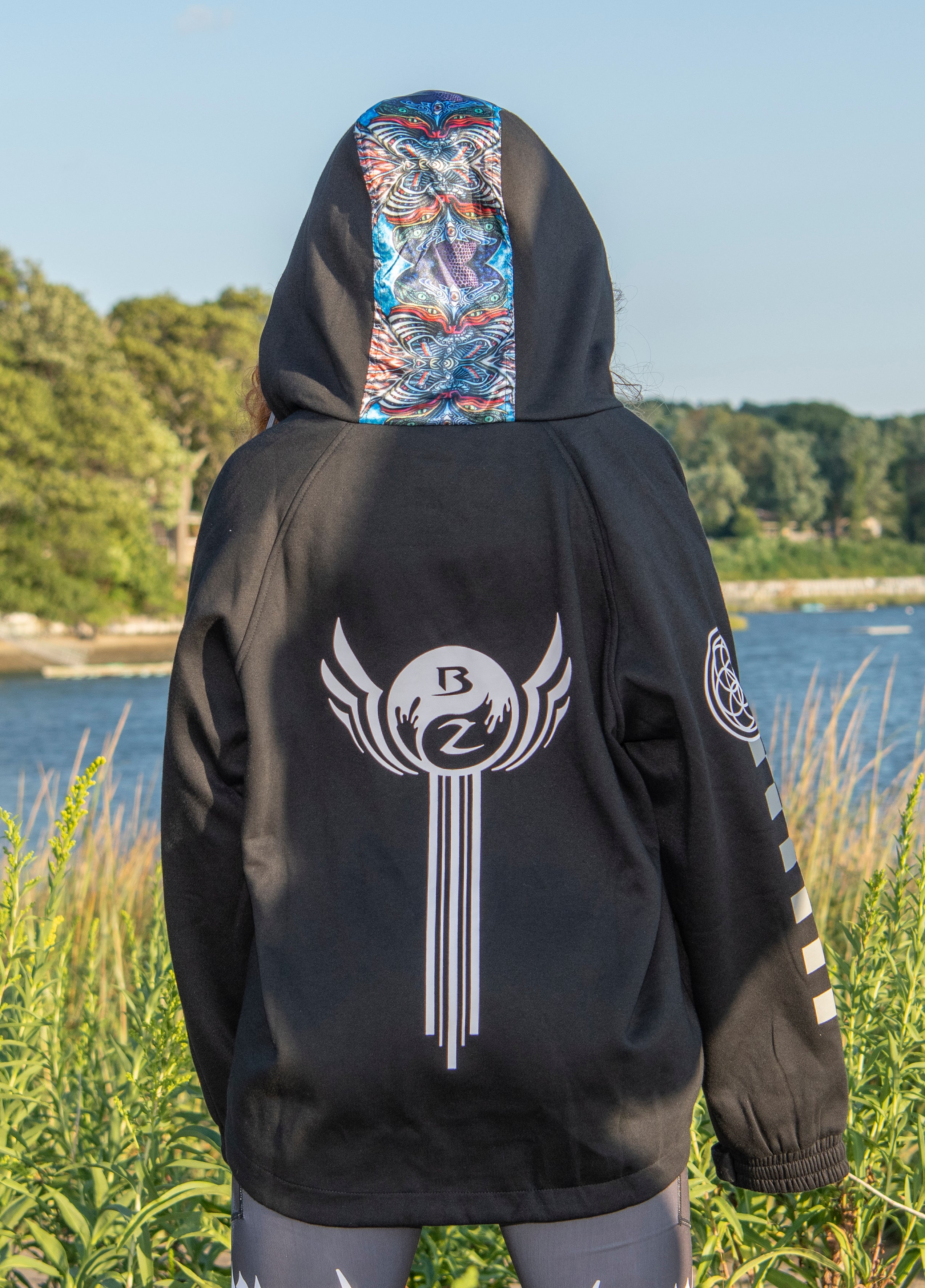 This Zip up is lined with Artwork by Sun zumwhalt on a silky Interior,and Fresh clean design done by Demi casares on the exterior. The Beauty is in the Detail in this one.